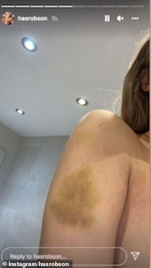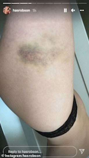 It was followed up with an image of her right knee littered with bruises as she sat on a sofa.
